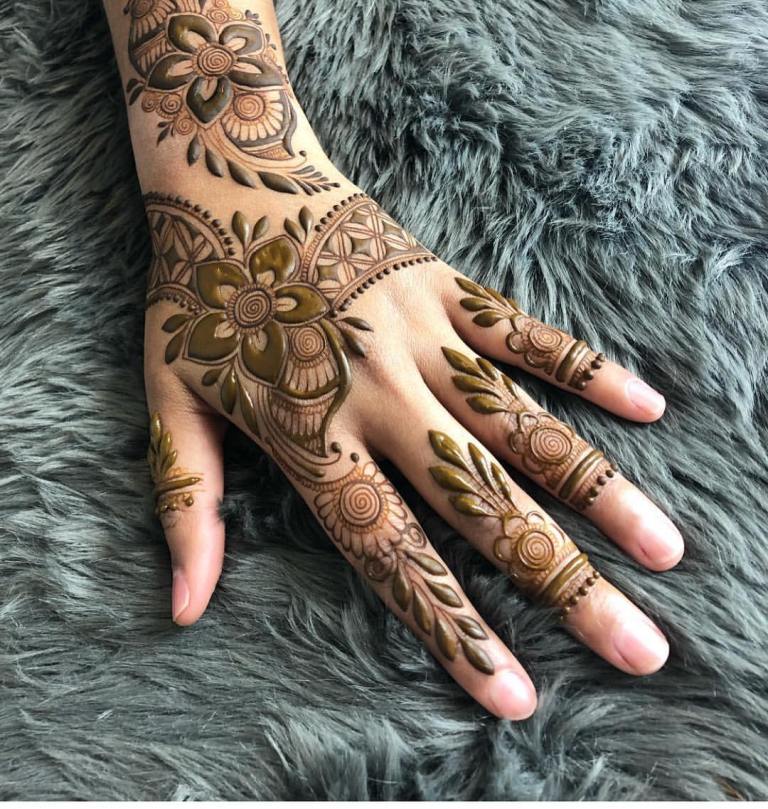 Το πίσω μέρος του χεριού είναι το πιο συχνά διακοσμημένο χέρι. Μπορεί να είναι τόσο απλό όσο ένα απλό mehendi στο χέρι που είναι εύκολο για έναν αρχάριο να σχεδιάσει ή τόσο πολύπλοκο όσο ένα σχέδιο με πολλά μοτίβα. Ακολουθούν τα πιο συνηθισμένα μοτίβα που εφαρμόζονται σε αυτόν τον τομέα: