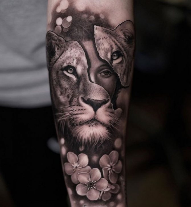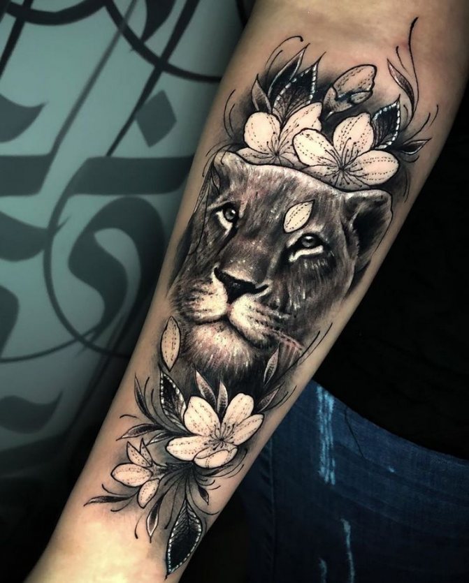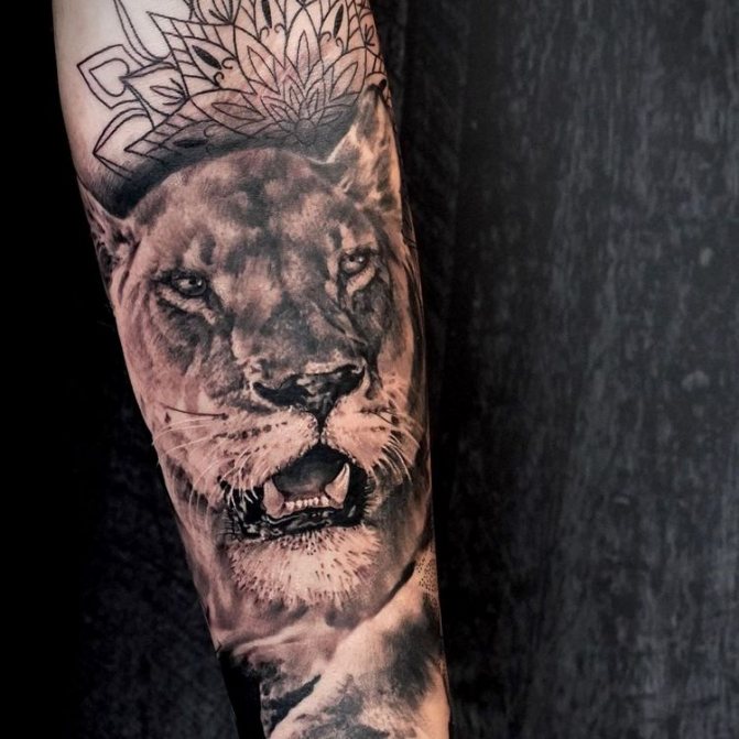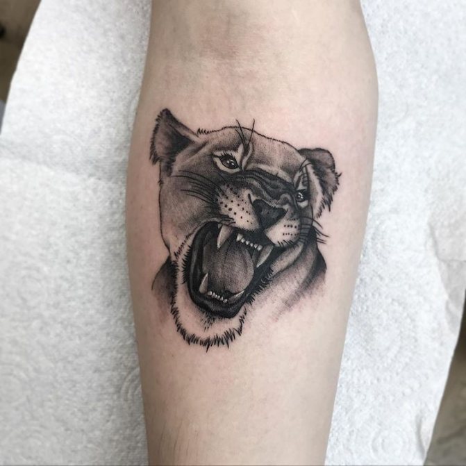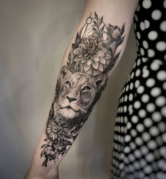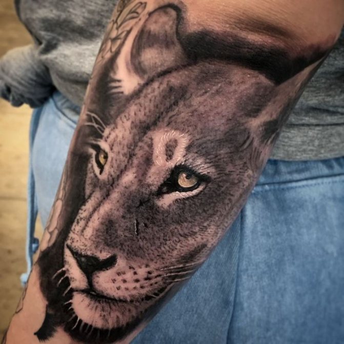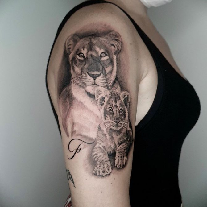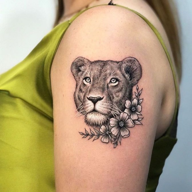 Το τατουάζ μιας λέαινας είναι Σύμβολο της μητρότηταςΧάρη και ομορφιά. Δείχνει δέσμευση στις οικογενειακές αξίες. Ταυτόχρονα, η εικόνα του ζώου σηματοδοτεί τη σωματική δύναμη και την προθυμία να προστατεύσει την οικογένεια.