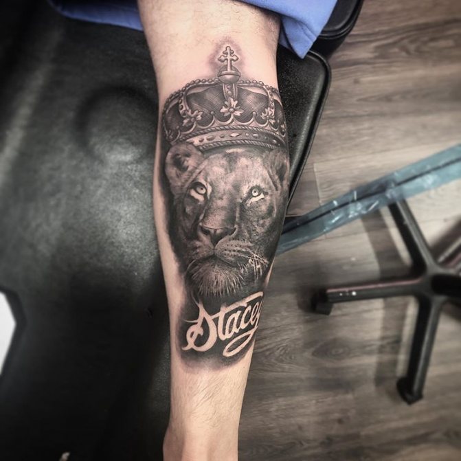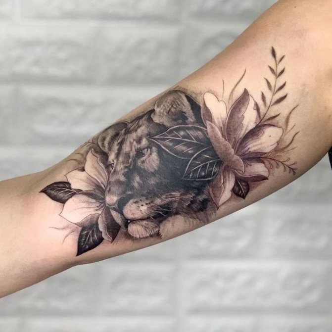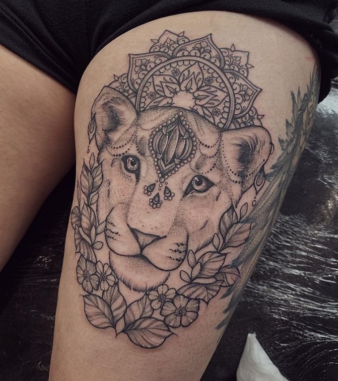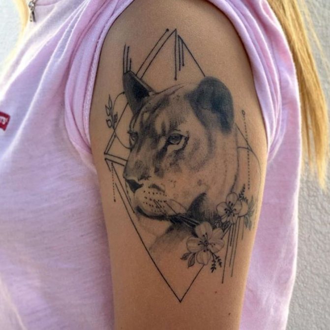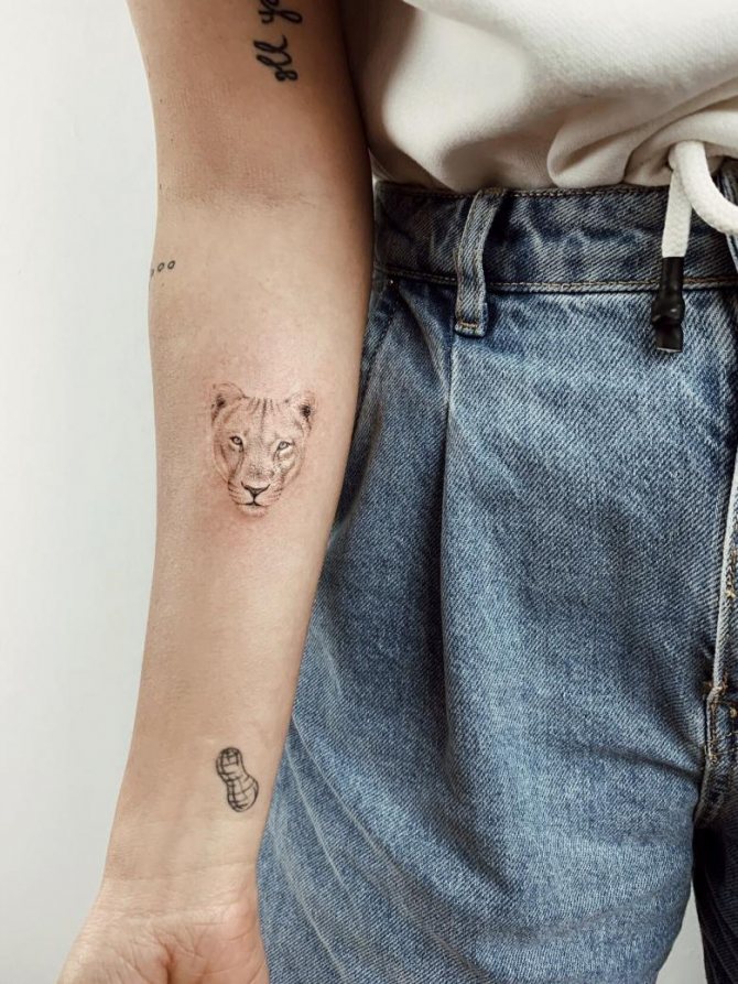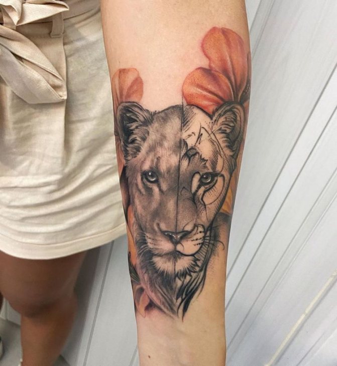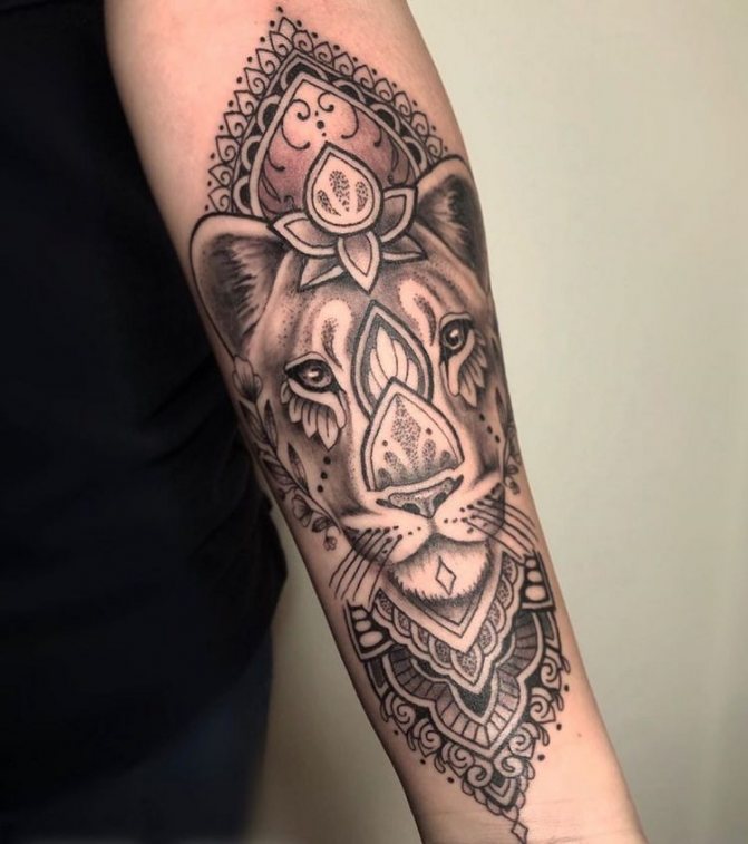 Το τατουάζ μιας λέαινας είναι Σύμβολο της μητρότηταςΧάρη και ομορφιά. Δείχνει δέσμευση στις οικογενειακές αξίες. Ταυτόχρονα, η εικόνα του ζώου σηματοδοτεί τη σωματική δύναμη και την προθυμία να προστατεύσει την οικογένεια.