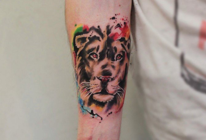 Πανέμορφο τατουάζ ενός λιονταριού και μιας λέαινας, που απεικονίζεται σε διαφορετικά στυλ. Για παράδειγμα, στο χέρι ενός κοριτσιού μοτίβο ακουαρέλας, και στο χέρι ενός άνδρα - κλασικό, τρισδιάστατο, γεωμετρικό και ούτω καθεξής.