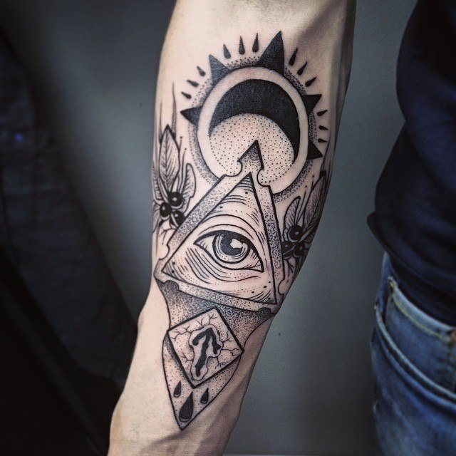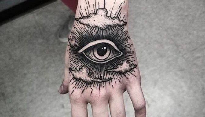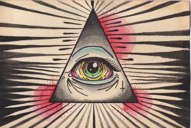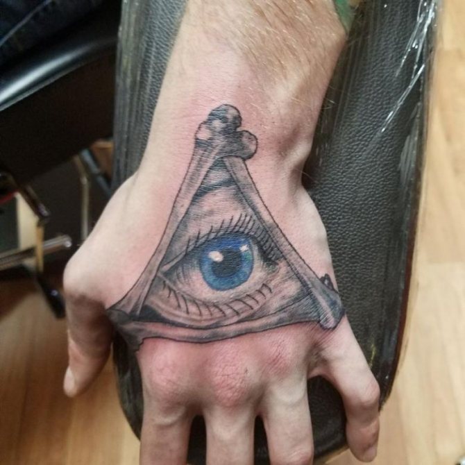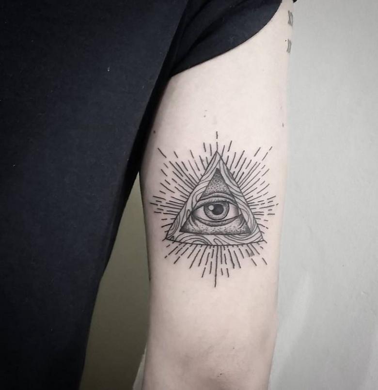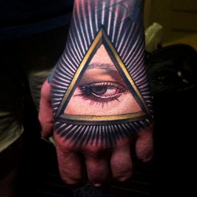 Το τατουάζ με το μάτι που βλέπει τα πάντα μέσα σε ένα τρίγωνο άρχισε να χρησιμοποιείται από τον 18ο αιώνα, όταν αυξήθηκε το ενδιαφέρον για τον αποκρυφισμό της εργασίας. Η εικόνα προέρχεται από την αλχημική ορολογία. Συνδυάζει δύο σύμβολα - το τρίγωνο που συμβολίζει τη γη και το μάτι που συμβολίζει την προστασία.