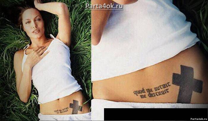 Υπάρχει μια επιγραφή στα λατινικά "Quod me nutrit me destruit" στο κάτω μέρος της κοιλιάς, η οποία μπορεί να μεταφραστεί ως: "Αυτό που με τρέφει με σκοτώνει". Δίπλα στην επιγραφή αυτή υπάρχει ένας μεγάλος μαύρος σταυρός. Προηγουμένως, στη θέση του ήταν ένας δράκος, τον οποίο η Jolie τσιμπολογούσε ενώ ήταν μεθυσμένη, στη συνέχεια συνειδητοποίησε ότι δεν φαινόταν στα γένια της και απλά τον ζωγράφισε με αυτόν τον σταυρό, ο οποίος της θυμίζει ένα στιλέτο που προεξέχει από το παντελόνι του.
