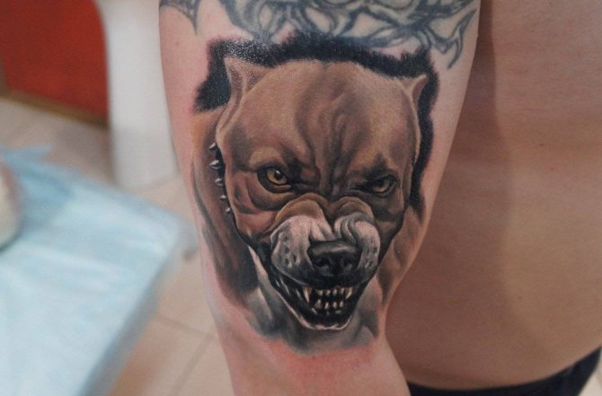 Τατουάζ ενός pit bull στη γάμπα, το πόδι ενός άνδρα: νόημα, φωτογραφία