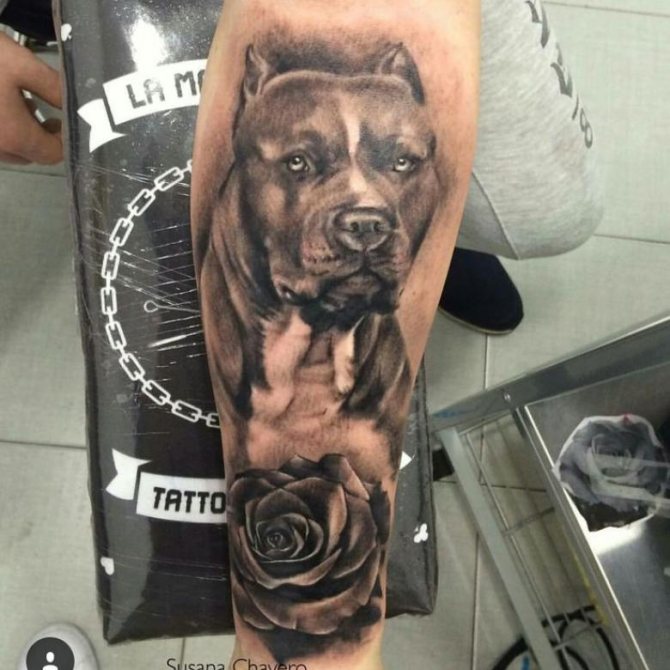 - Παρεμπιπτόντως, υπάρχουν περιπτώσεις όπου οι άντρες κάνουν τατουάζ με τα αγαπημένα τους κατοικίδια - πιτ μπουλ. Σε αυτή την περίπτωση, χαρακτηρίζει τον άνδρα ως πιστό και στοργικό ιδιοκτήτη.