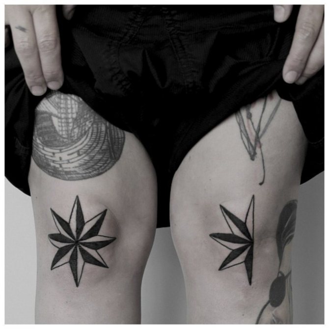 A tattoo on one's knees is a symbol that a person is not ready to bend and literally kneel before someone. For example, if a criminal has stars depicted on his knees, it means he loves freedom and refuses to obey the laws.