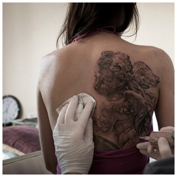 A woman with wings was applied as a tattoo as a talisman