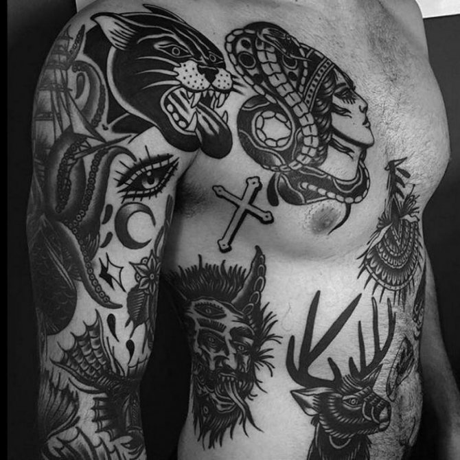 Also in demand are tattoos in the style of old-school, characterized by brightness and richness of drawings. What is interesting, similar images can be worn by representatives of absolutely any social strata.