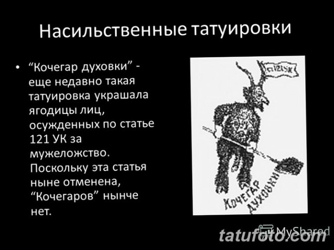 In most cases, the tattoo of the stoker's devil is applied in the case of a forced "straight" descent (homosexuals, who have become on this path of their own free will, have different tattoos). However, it is difficult to call this undistinguished image a tattoo; rather, it is an indistinct, hastily made sloppy body drawing.