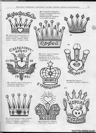 - The five-pointed crown with a heart (white inside) and the signature "daisy" on the back indicates a homosexual, if the heart is painted black - a person capable of all forms of sexual intercourse, the crown with the signature T.A.V.D.A. between the five ends of the crown and the "Orpheus" on the place of the heart from below determines the authority in the circle of the "downcast" (he may be called the "chief rooster").