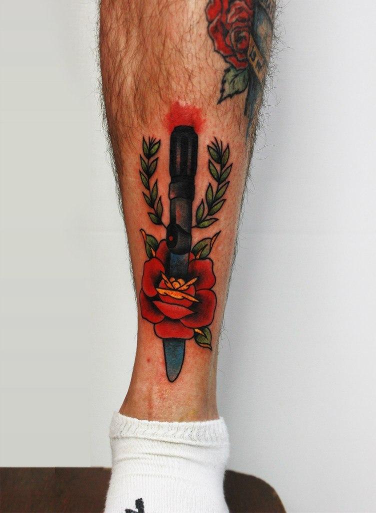 A simple and so humble tattoo that the association with edged weapons recedes into the background when looking at the drawing. In the first place - a clear drawing of lines and original filing. Organically placed on the back of the calf.