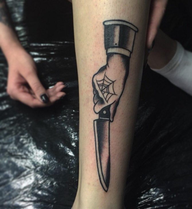 Such drawings symbolize the stealth of a person. The ability to deliver an unexpected blow. A tattoo of a cold weapon is most often placed on the thigh or on the arm, exactly where the weapon is worn in a special pouch. Men often depict guns in the lower part of the abdomen, which creates the effect of a weapon gagged behind the belt. The size of the image usually replicates the actual size of the weapon as much as possible.