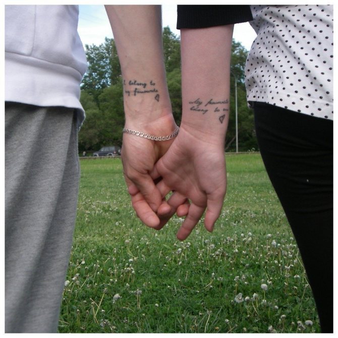 Widespread joint tattoos for couples on the wrist. Represented in most cases, a bracelet, half an inscription or the same pattern.