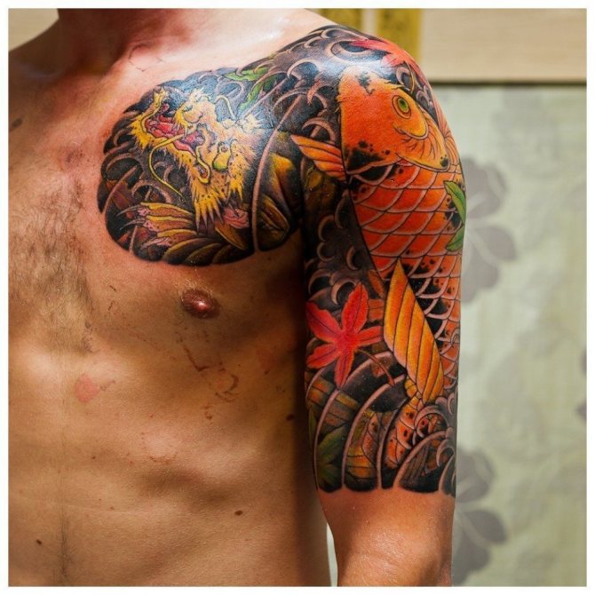 Despite the enormous popularity of black and gray tattoos, colored tattoos are also in considerable demand among the stronger half of mankind. Of course, the main reason for this demand is the choice in favor of the Japanese tattoo technique.
