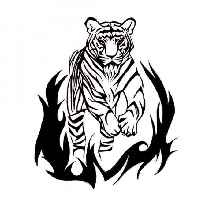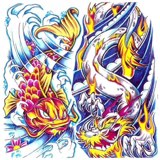 In addition to the image of the animal, the Japanese style tattoo contains intricate circles or is complemented by elements of the element to which the animal belongs. Usually these are bright waves or bursts of flame.