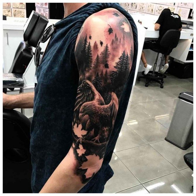 Large tattoos look very harmoniously on a man's shoulder. And no matter what style they are made in. This can be a blackwork, and Japanese drawings, and even a contour tattoo.