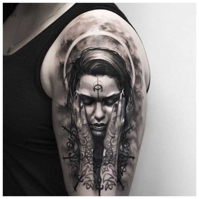 Realistic tattoos can be of any size. The most common version of this tattoo is a female portrait or an image related to religious themes. In second place in popularity are drawings of real animals (tigers, eagles).