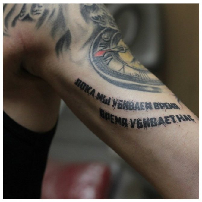 The inscription is chosen mainly in Latin, English and Russian. The basic font is Gothic. The most common tattoos with text: