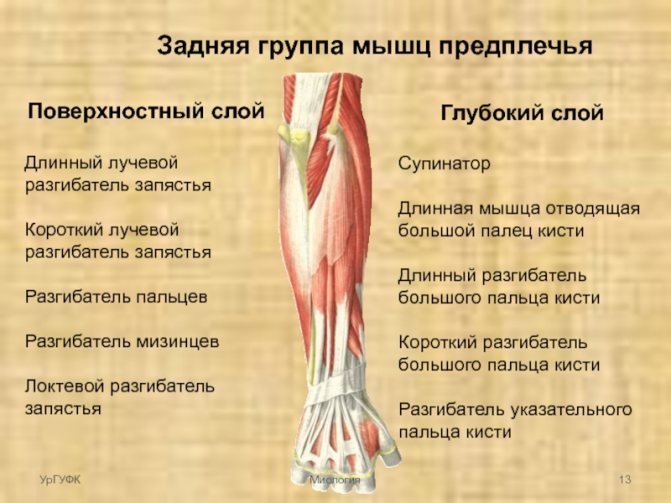 The forearm has a direct affects the clenching force of the fist, the grip of small objects with the hand. Attached to the bone are the muscles responsible for flexion and extension of the upper extremity.. They are divided into two main layers: