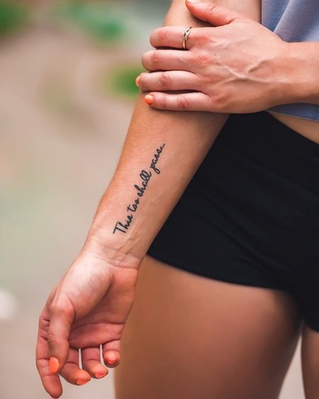 Instead of names on the fingers or wrist, you can place an aphorism or quote. Some sort of motto or reminder that is dear to the tattoo's owner. They say that just looking at such an inscription gives one a rush of strength and motivation to act. But the caricatured writing of letters on the fingers that form a word or name has long since been abandoned.