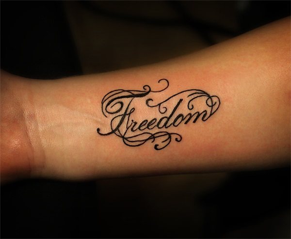 A word in English that means "freedom." Freedom of action and thought. Such a tattoo on the arm do on emotion, breaking up with a boyfriend or leaving parental care.