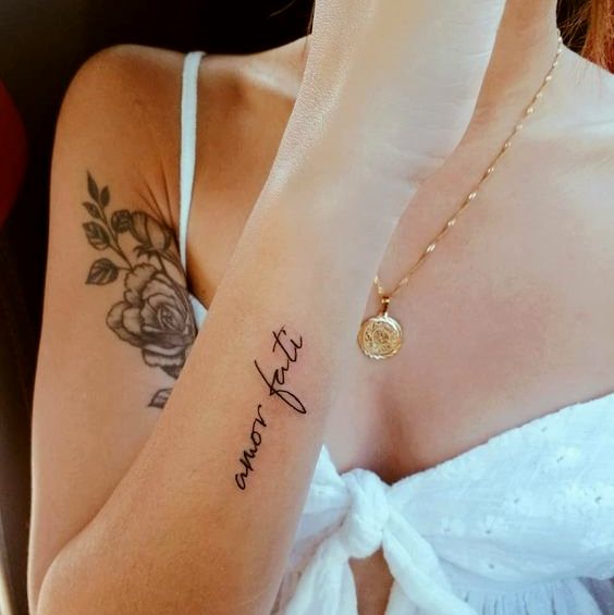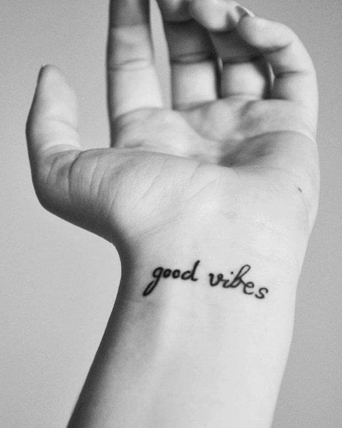 - Inscriptions: winged phrases, oaths, anniversaries or life mottos; very relevant tattoos on the wrist for girls, applied in Latin or a foreign language; phrases in Russian are less popular, they are used only to "perpetuate" the names or initials of loved ones;