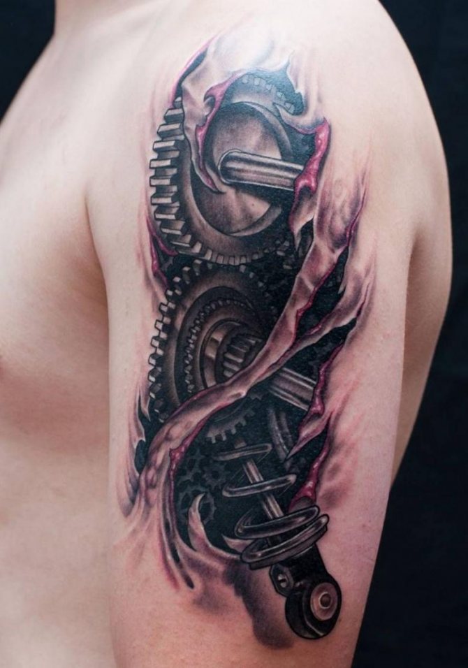 Popular is the biomechanics style. It is often chosen by men: LEDs, pistons, microchips, chips, watches, which are viewed through the torn flesh. Through this genre, guys express their courage, strength, courage.