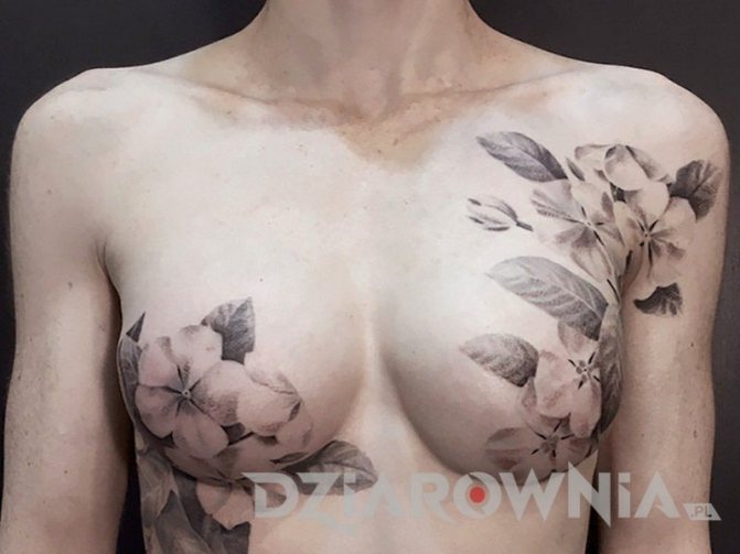 Realistic representation of nipples after mastectomy is one of the available solutions, another interesting approach in tatuowaniu, is more artistic. In this case, women often choose floral motifs that disguise the lack of bumps and scars after surgery. I have to say that flowers are great with female beauty, and looking at these breasts, you can completely forget about your problems from the past. Choosing this way limits us only our imagination, because in this way you can really tattoo yourself anything, but you have to say something unambiguously, pictures associated with flowers look exquisite and carry with them a certain text. Flowers, just like women are beautiful, and can time the bud blossom again. It is an analogy to a kind of rebirth and reconciliation with himself. Tattoo will not make that difficult memories will pass, but may help to leave the burdens of illness behind, to restore self-esteem and self-confidence.