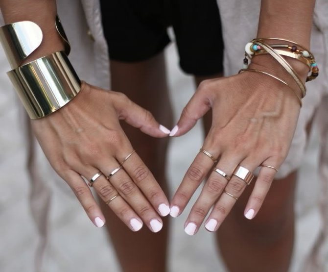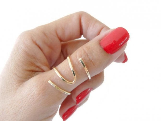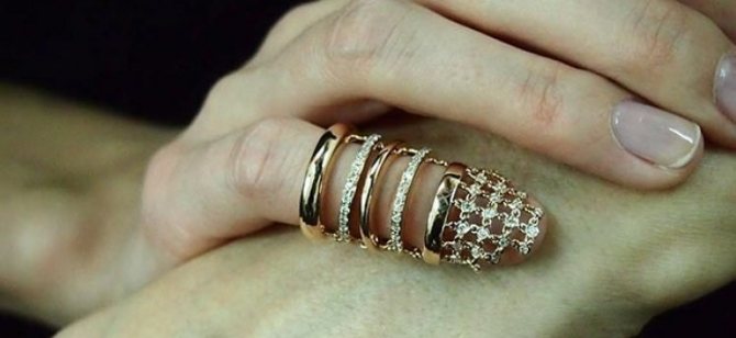 For years now, fashion has been dictating that we can wear many rings at once. And another interesting option has become that often rings are worn on the uppermost phalanx of the finger. This is quite original. Fashionable jewelry is relevant only in the warm season. In winter to wear such rings is irrelevant. But in any case, a measure is important. If you want to wear several pieces of jewelry at once, remember that they should be combined. Be sure to match the color of the metal, it must be identical. You should not combine gold and silver, as well as precious metals with simple costume jewelry. Although you can make an exception, but that is on the condition that you come up with a beautiful and interesting image.