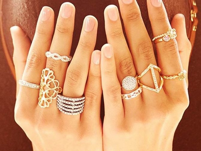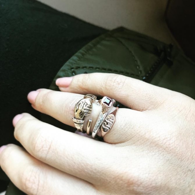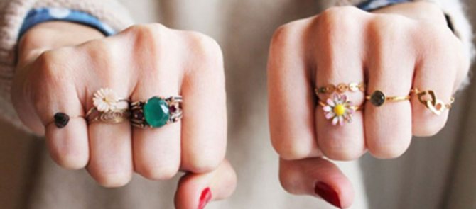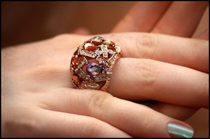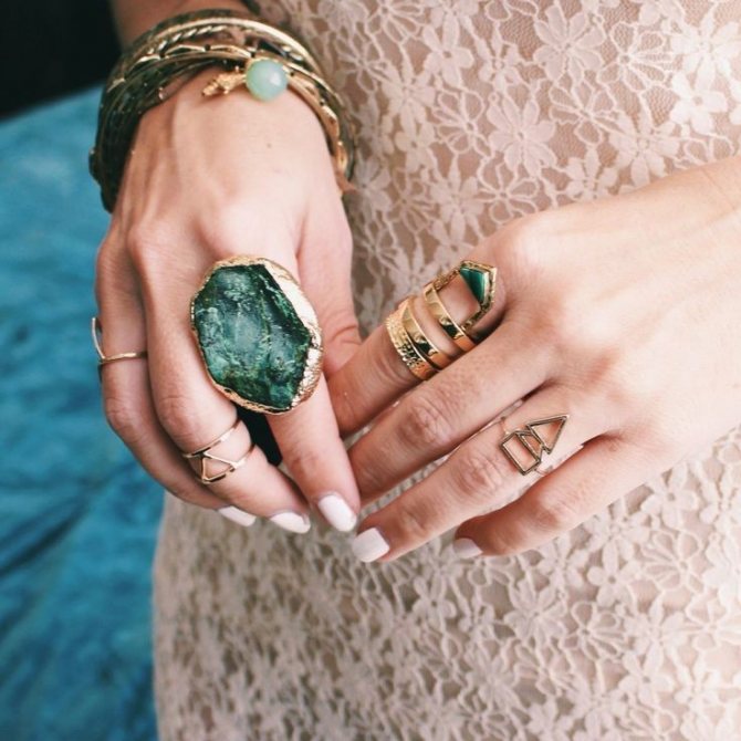 A ring is not just a piece of jewelry. It can carry a lot of information, especially if it comes to you by inheritance and is a family jewel. It has long been known that such jewelry absorbs all the information from the person who wore it. But if you like it madly and you want to wear a ring, you can just hold a certain ritual of purification of the ring, and feel free to wear it. When choosing a ring, remember that it is not only the beauty of the ring that matters, but also the right combination of each other. You don't have to wear jewelry made of gold or silver. Designers offer beautiful rings made of simple metals, plastic and stones. Small or massive jewelry will emphasize your style and personality.
