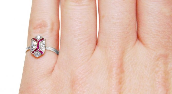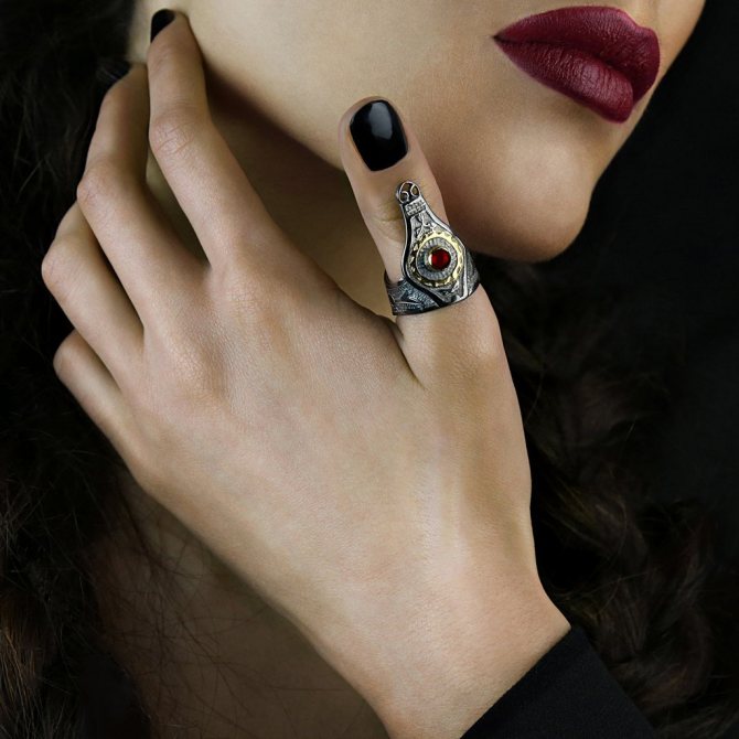 Most often rings are worn on this finger. First, it is convenient, and secondly, it is the finger that stands out, especially if the girl has a beautiful manicure. Chiromancers and astrologists do not recommend to wear a ring with red stones on the middle finger, especially if it is a combination with gold. This is a combination that worsens the situation in the personal life of the girl. Also important is the size of the stone. If it is very large, it attracts attention, and this suggests that the girl is open to communication. Small stones, beautifully adorn the cute hand of a fashionista.