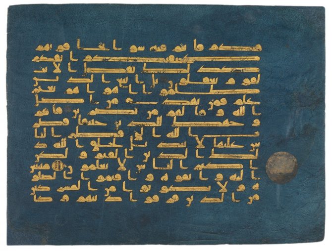 "Blue Koran." Presumably from Kairouan. Tunis, second half of the ninth to mid-tenth century. Sample of Abbasid kufi. Parchment colored blue, gold ink used. According to tradition, the Blue Koran was commissioned by the Abbasid caliph Abd al-Ma'mun for the tomb of his father Harun ar-Rashid in Mashhad, Iran. For unknown reasons, it never made it from North Africa to Iran.The Metropolitan Museum of Art