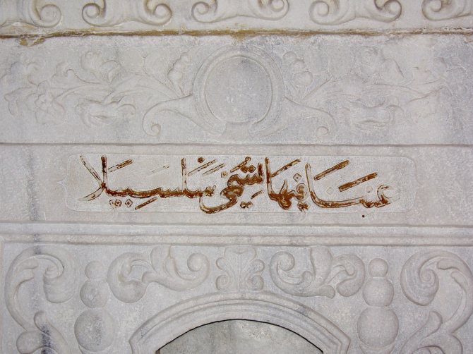 On the buildings of the baths and on the fountains of the springs the masters often placed ayats related to water, which in the Koran is mentioned almost always in pictures of paradise. For example, sura 76, ayat 21: "And he gave them [the young men of Paradise] a pure drink" (وَسَقَاهُمْ رَبُّهُمْ شَرَابًا طَهُورًا); or sura 76, ayat 18: "[The righteous will drink water] from the spring called Selsebil" (عَيْنًا فِيهَا تُسَمَّى سَلْسَبِيلًا) - meaning that they will drink it in paradise. These very lines are placed on several fountains in the Bakhchisarai Palace, including the famous Fountain of Tears.