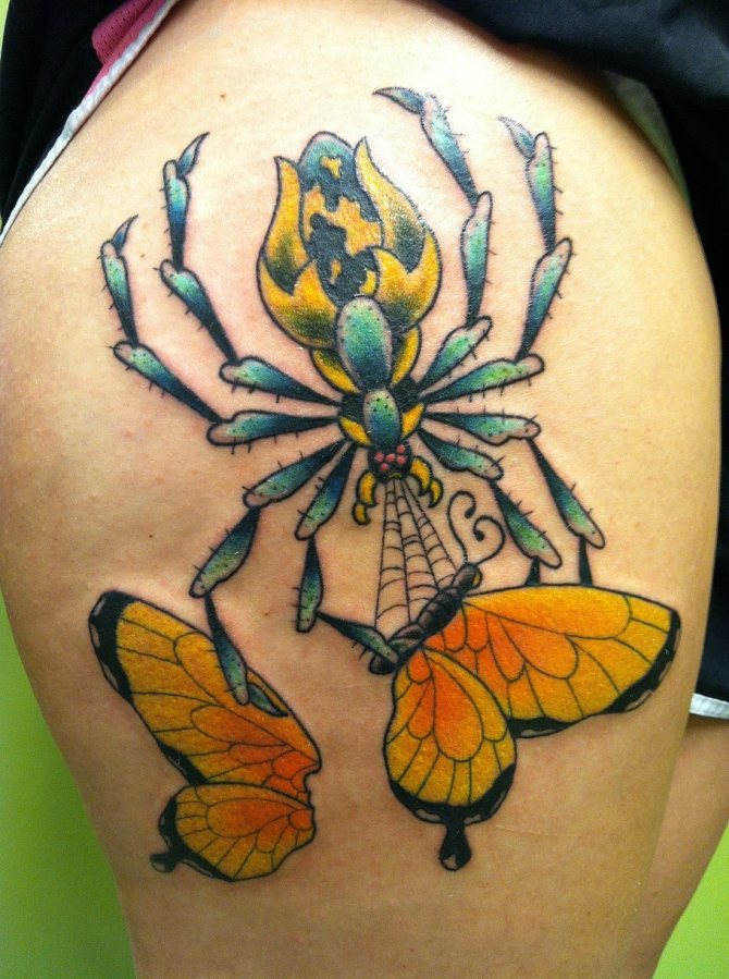 Old-school style tattoos imply a riot of color and profound symbolism. Even if the drawing has the outline of a butterfly, symbols on various subjects can be added to it. It can be faces, skulls, flowers - anything. The location is limited solely by the imagination of the tattoo owner - wings, abdomen or the space surrounding the insect.