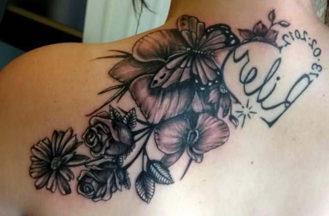 Among the works of tattoo masters there are sketches depicting several identical butterflies on a single flower. It is known that no two insects have the same image on their wings, so such drawings symbolize kinship and remind their owners of family ties. Sometimes the names of favorite relatives are written on the wings - the master will tell you how to do it best.
