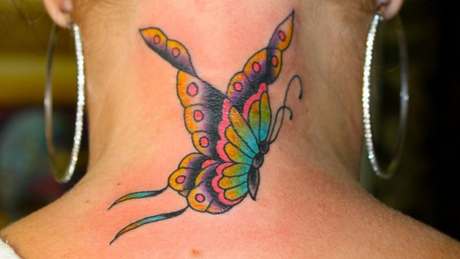 | Neck | The meaning depends on the part of the neck where the tattoo is applied. Risk-takers, for example, may place 2 symmetrical butterflies on either side of the neck, and the drawing on the back is often interpreted as a desire to obtain protection or patronage from the creature depicted. |