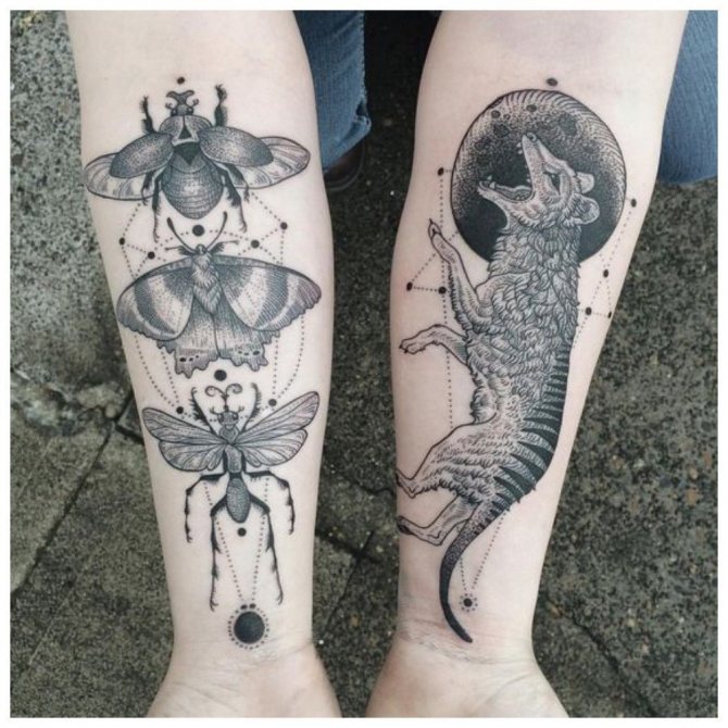 Drawings can be done in black and white or in color. The first option will appeal to those who like restraint. Such a tattoo is suitable for any costume and stylistic image.
