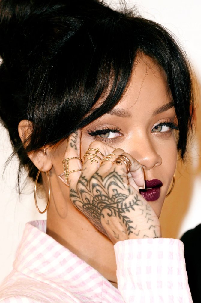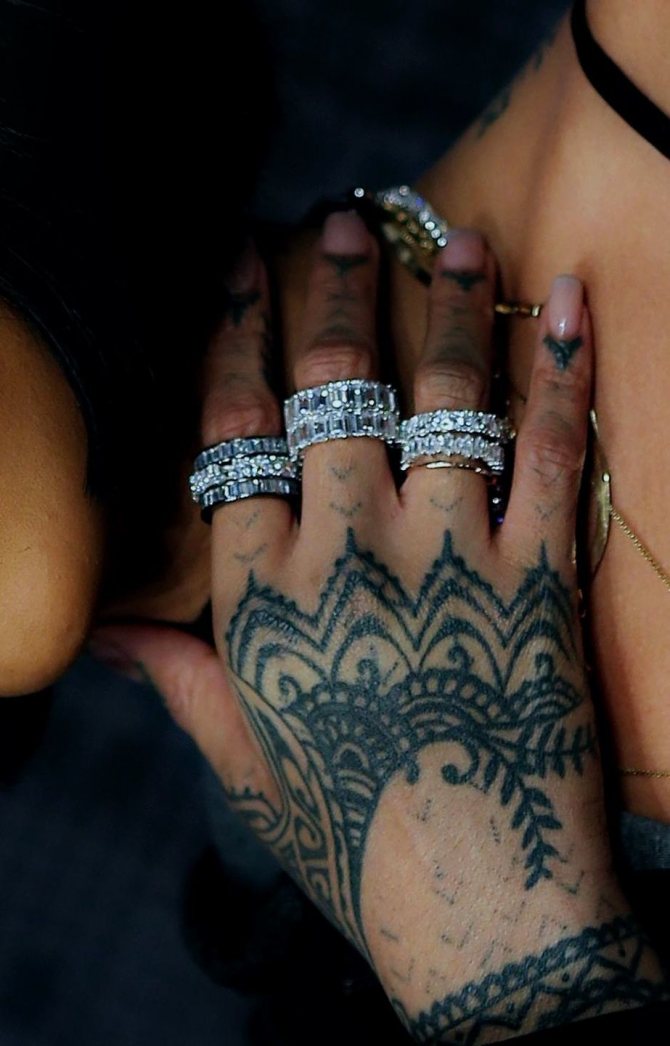This is interesting: the singer Rihanna wears an unusual tattoo with a unique history of creation just on the right hand. The original pattern was applied to the hand in New Zealand by means of an ancient technique, when the ink is driven under the skin with a special hammer and chisel. The result of the painful application procedure did not really impress the star, so later the tattoo was finished in the salon. According to the singer, the abstract pattern symbolizes love.