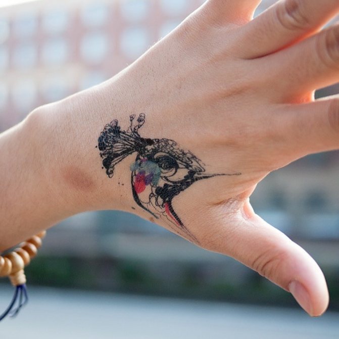 Colored tattoos are the most common. With their help, you can create complex and three-dimensional images consisting of a large number of details. Usually these are images in the form of birds, insects or animals, as well as in the form of one or more colors.
