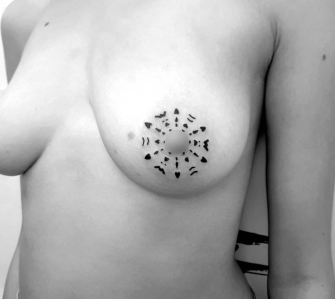 Today, the SAC area permant is quite popular. Girls put on the breast whole pictures, do tattoo in the form of a top completely covering the glands, or put shaped "tattoos" in the form of a heart, a flower or a sun on the areolar complex itself.