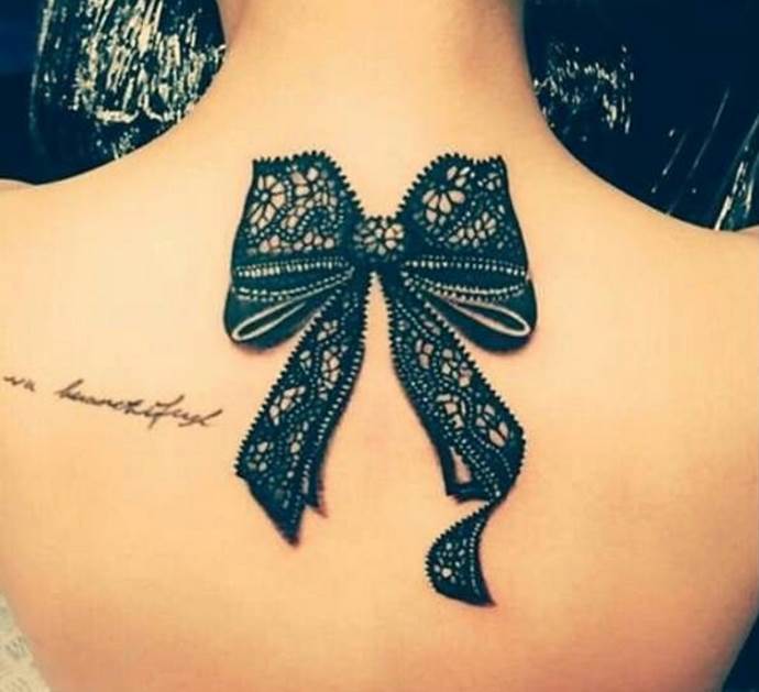 - The bow located between the shoulder blades looks interesting, both monochrome and with the use of different colors. Such a tattoo will not bore its owner and will add charm and sophistication.