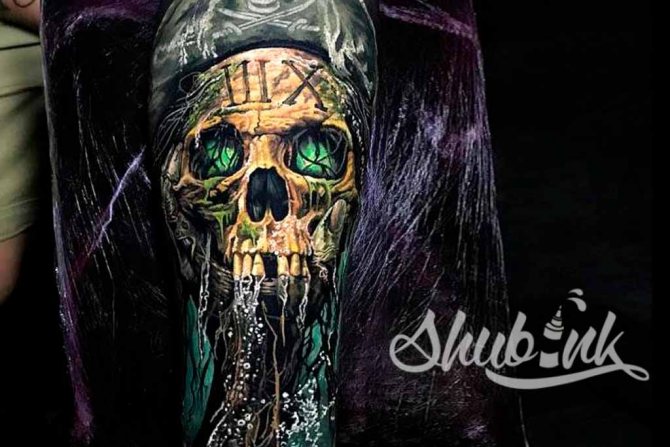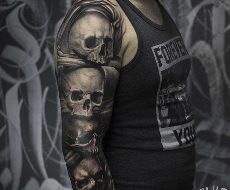 The most common place to place a skull tattoo is in the shoulder and back area. On the leg, the tattoo is applied in the area of the shin and calf muscles.
