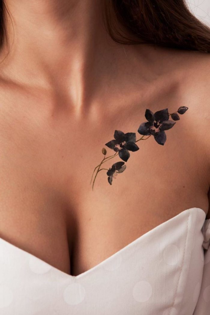 Tattoo of flowers on the collarbone is a popular option, it is a feminine, beautiful tattoo. The image of a flower carries a certain symbolic meaning.