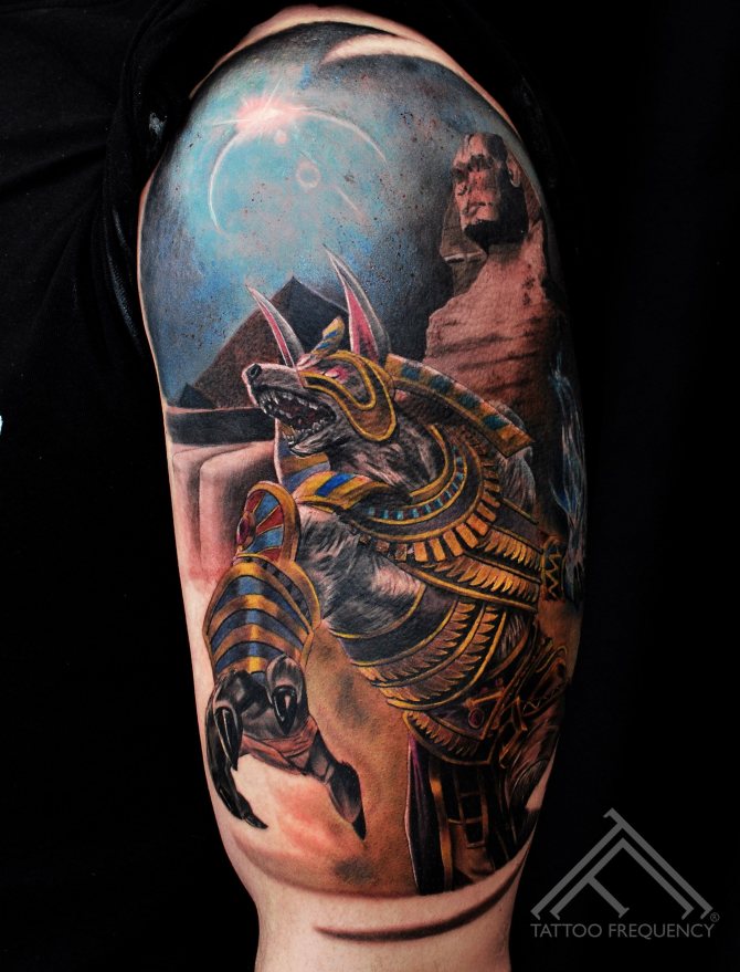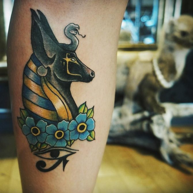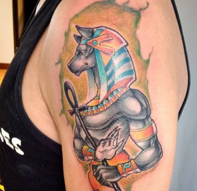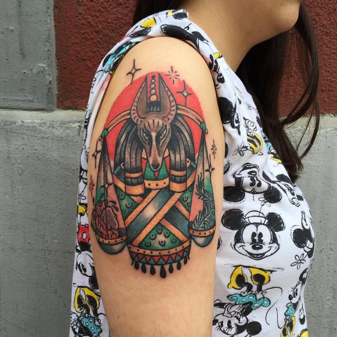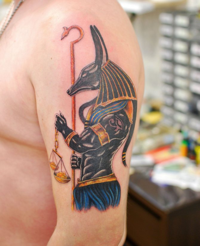 - A large-scale panel with Anubis armed with attributes will protect the owner of the tattoo from injury. The main character is also placed surrounded by associates in the divine pantheon - Upuat (guide to heaven), Kebhut (the goddess of embalming).