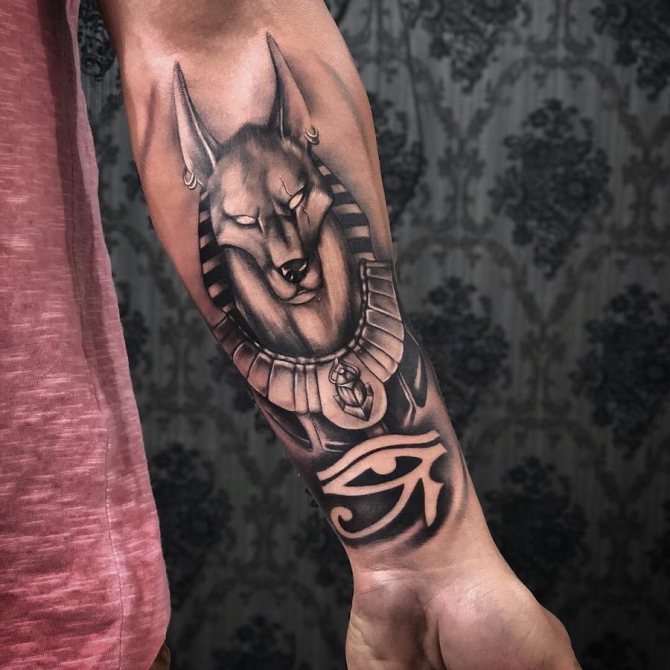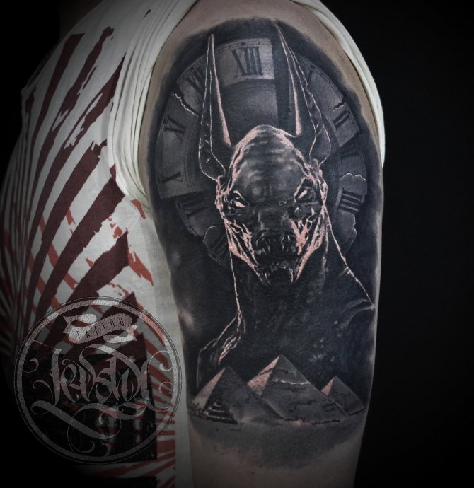 The main message of the tattooed sign is based on the reputation of jackals. The aggressive animals prowled the suburbs of ancient Egypt, where there were necropolises intended for burial. Therefore, in the ancient culture of Egypt, the character of legends was attributed the function of guarding the dead. The living pictures of Anubis reminded of the ban on disturbing the souls of the departed in the other world.