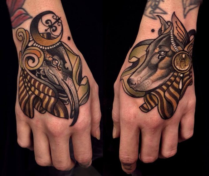 The most popular image today recognized the classic version of the tattoo with Anubis, where the human face of the god is crowned with the head of a dog or jackal. The plot of a bright sketch in a minimal color scheme is often complemented by symbols that belong to the otherworld.