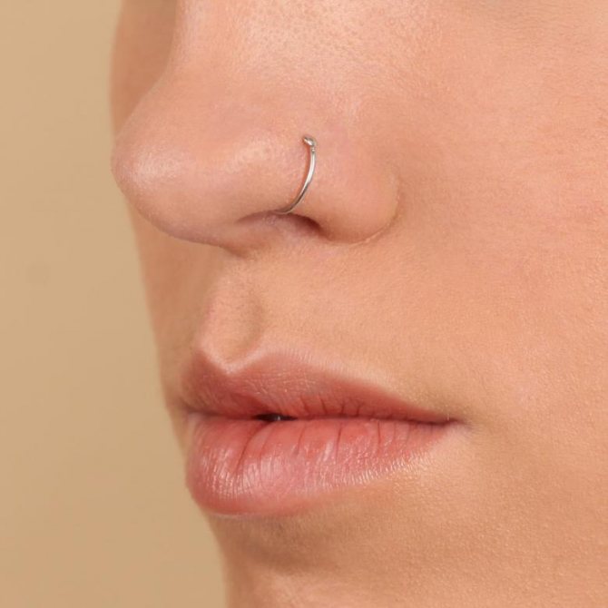 For piercings without a nose piercing, the choice is not so great. First, because in itself the number of piercings of different types on the nose is quite limited. It is either a piercing of the wings of the nose or Septum. There are only two options for such piercings. The first is in the form of the already known to us ring, which is conveniently attached both in the wings of the nose, and on the septum. Well, the second one is just another option for going out for one evening. That is, to wear it longer will hardly be a desire, because it is easy to lose and inconvenient to fasten. These are small stones on the glue, which are glued between the wing and the sinus of the nose to imitate a nail earring.