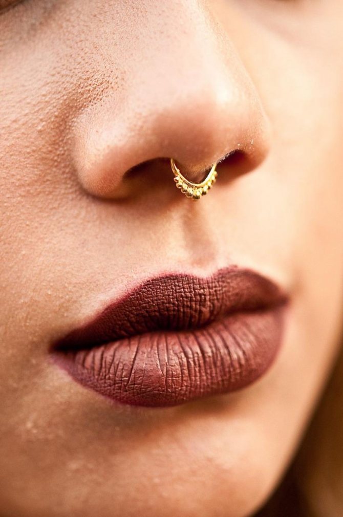 On the lips, too, in most cases it is suggested to use unlocked rings. Sometimes a small ball of metal or a shiny decorative element is fixed with a special glue. There are different colors of lip liner, but in most cases girls choose silver or gold colors to decorate their lips.