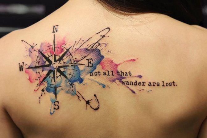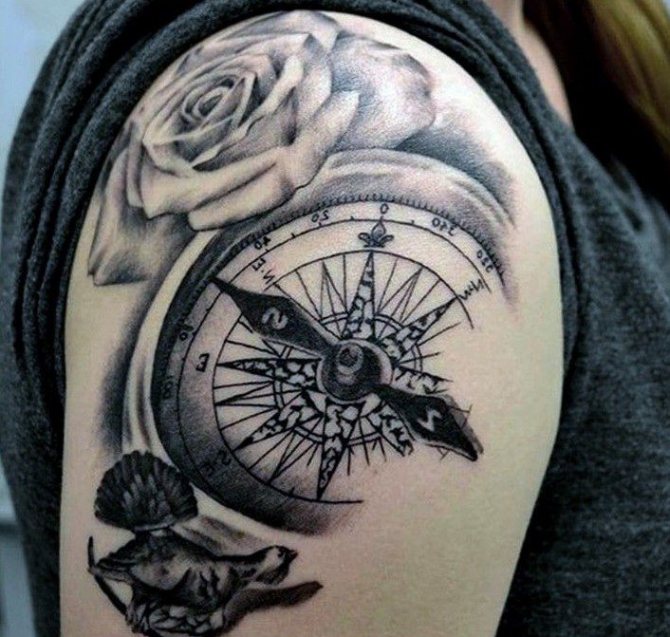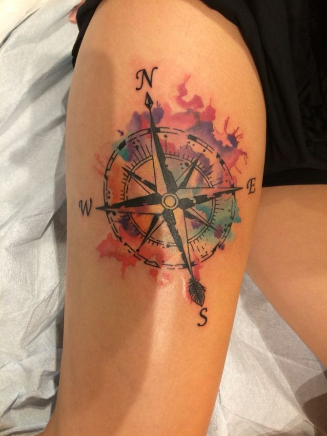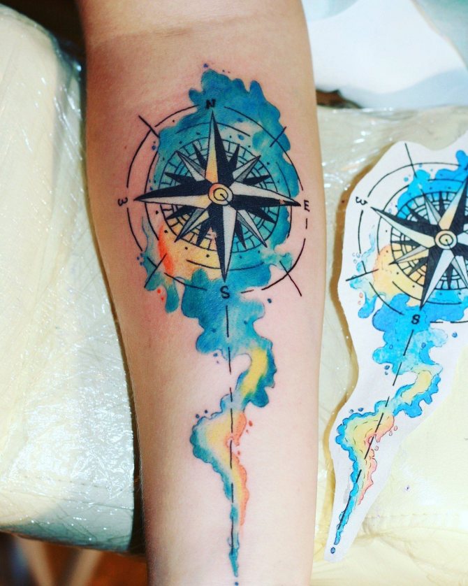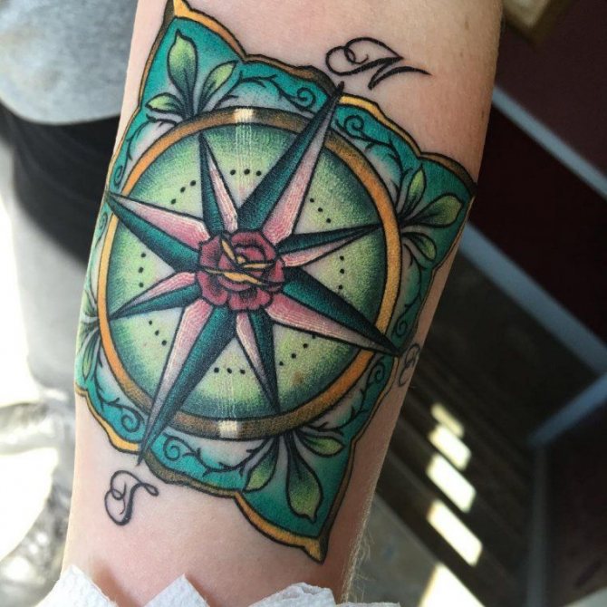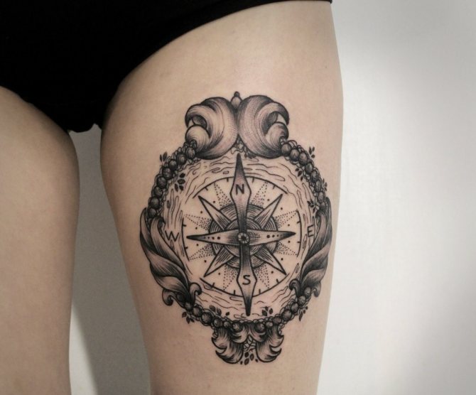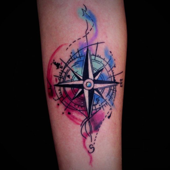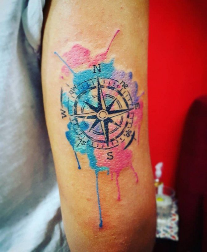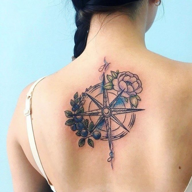 The tattoo of the wind rose is very rare, but still found in women. For the weaker sex it is typical to perform drawings in the style of oldskool or watercolor. A body drawing will denote the desire to travel and conquer new peaks, tireless willpower, freedom-loving stock of character. Such girls know their worth and will not be humiliated under any circumstances. In addition, the owners of the tattoo can supplement the sketch with unusual elements, which will indicate other strengths of a woman's character. There are cases when girls perform such a drawing, in order to produce an effect out of conformity with its special meaning.