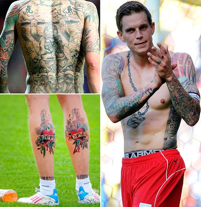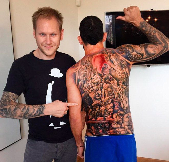 Agger's tattoos are a true work of art that can be included in the cultural heritage of Denmark. There is mythology, facts and dates. On the back is a whole fundamental "canvas. At the bottom are three Vikings: "I can't see", "I can't hear", "I won't tell". Above is the legendary Danish hero Ogier. Around him are the tombs of famous Danish kings. Even higher is the pale date of birth of the soccer player (1984) and the inscription Mors Certa, Hora Incert (Death is inevitable, but the hour is unknown). On the left shoulder - a continuation of the theme: the flag of Denmark, the supreme god of Norse mythology Odin and his companions crows. A rare soccer tattoo of a defender is YNWA on his fingers. This is a tribute to Liverpool, his hometown and the anthem of his fans You'll never walk alone. In general, there are almost no empty spaces on Agger's body. Even on the palm of his hand there is a small and most uncomplicated of all tattoos - a sun with sunglasses and a cigar. By the way, Dani is so imbued with love for the art of tattooing that he has mastered the technology of their application himself and has already made some friends happy with his creations.