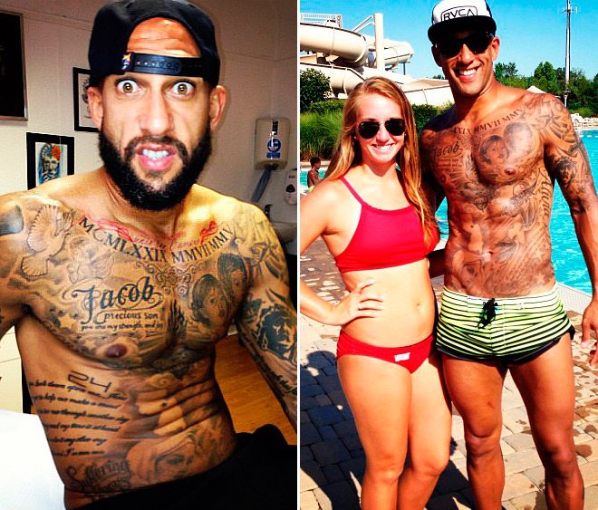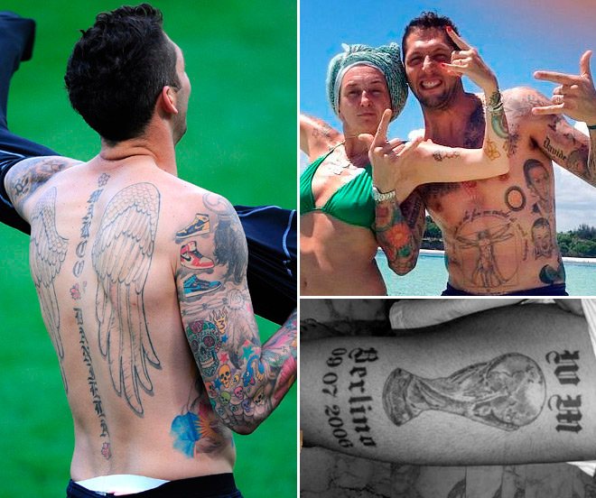 Another representative of the older generation, when tattoos had not yet become a mass phenomenon among soccer players. Marco has so many of them, that there is enough for a whole guidebook. He actively "scores" colored tattoos, while most prefer the classic monochrome ones. It all started with a modest letter M at age 18. Then it went on and on. Some of the tattoos are dedicated to family and friends: his mother, who died of cancer when Marco was a teenager, his wife Daniela, his daughter Anna. Materazzi has wings on his back, which did not go well with his behavior on the field. There is a mark of his beloved wife's kiss on his collarbone, a snake, a dragon, a lion (Marco's zodiac sign), two stars. The veteran has Leonardo da Vinci's Vitruvian Man on his stomach, and on the right side of his chest there is a mysterious Indian, the exact same one Materazzi's wife has. He has plenty of sports tattoos, too. His favorite number 23 is sacred for the Italian - it is the date of his wedding and the birth of his daughter. On Marco's body there are pictures of the first Scudetto, World Cup trophies and Champions League, which he also won. A separate topic - the Nike sneakers on the right shoulder, as many as three pieces. There is another unique tattoo - an autographed helmet of motorcycle racer Valentino Rossi.